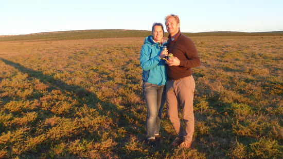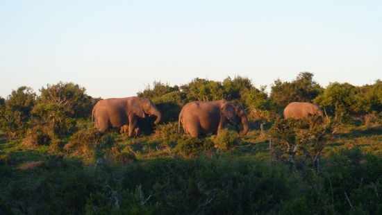 Unsere nächste Etappe war der Addo Elephant Park. Auch hier hatten wir uns eine Unterkunft im Park geleistet, um die Zeit dort ausgiebig genießen zu können. Der Park macht seinem Namen wirklich alle Ehre. Wenn wir in Imfalozi noch jeden Elefanten, war er noch soweit weg, gewürdigt haben, zückten wir hier nicht mal mehr die Kamera. Überall traf man auf große Elefantenherden, teils direkt am Wegesrand. Jan und ich gönnten uns die Sundowner-Safari (yippi, wir haben einen Babysitter) mit einem leckeren Bierchen im Sonnenuntergang mit Blick über die Steppe. Es war wunderschön und bei der Ausfahrt aus dem Park lief uns ein Löwenpärchen quasi direkt über den Weg. Ein perfekter Abschied. Da sich der Addo Park seit einiger Zeit bis ans Meer zieht, nutzten wir die Mittagszeit für einen kleinen Abstecher in die Dünen, Mittagessen und Spaßfotos.