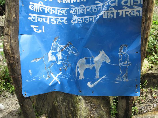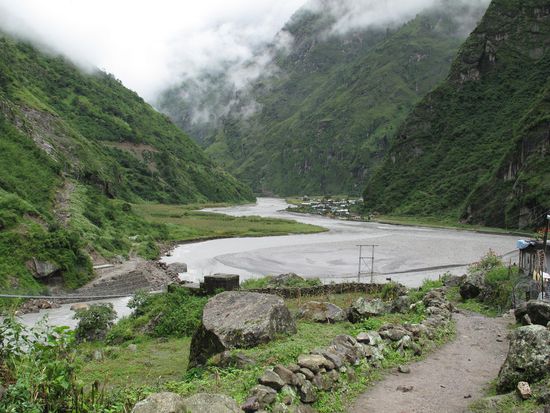 Wir wollten früh aufstehen, schafften es aber nicht und Hannes weckte uns auch lange nicht, ich denke weil es geregnet hat. Gegen 8 Uhr klopfte Hannes dann mal und wir gingen Frühstücken, packten danach unsere Rucksäcke und schauten der anderen Gruppe beim Aufbrechen zu. Als der Regen nachließ gingen wir los. Am Hauptweg trafen wir dann unsere Gruppe vom Vortag und erfuhren, dass sie einen Ort weiter unten übernachteten. Der Weg führte dann über eine Hängebrücke und ging wieder stetig bergauf bis zu einem Pass. Dann wieder hinunter in den Ort Tal. Wir pausierten nach der Ortschaft am Fluss an einem großen Stück schwarzem Strand. Wurden aber leider schnell wieder aufgescheucht, da zwei Militär sagten es gibt eine Sprengung in der Nähe und wir müssten aus Sicherheitsgründen weiter weg. Es war total heiß, wir hatten Hunger und Leon und ich waren etwas erschöpft gingen aber noch ein ganz schönes Stück weiter. Es kam längere Zeit kein Ort aber dafür war auf dem Weg ein Zelt an dem die Träger Pause machten. Wir bekamen dort dann auch Dal Bhat und konnten danach wieder etwas fitter weiterlaufen. Wir blieben in Dharapani, da wir ziemlich fertig waren und es mir nicht ganz so gut ging.