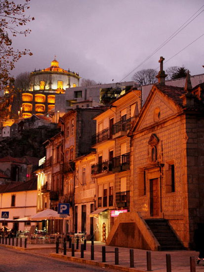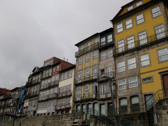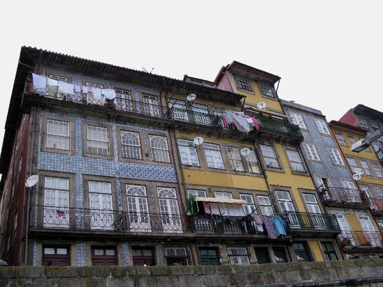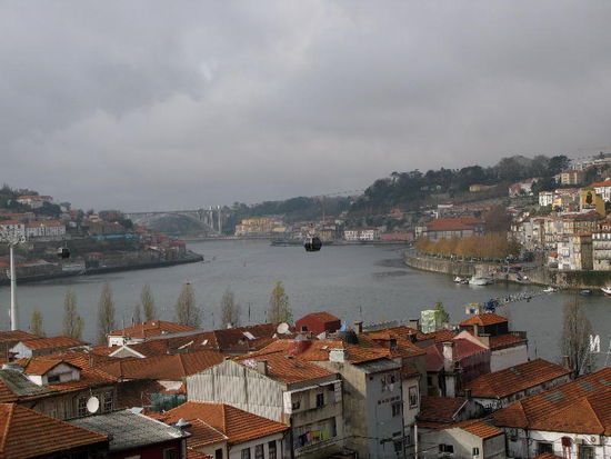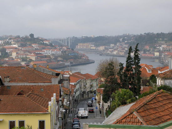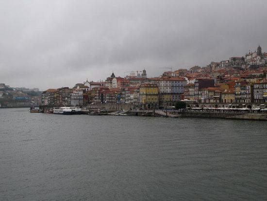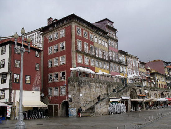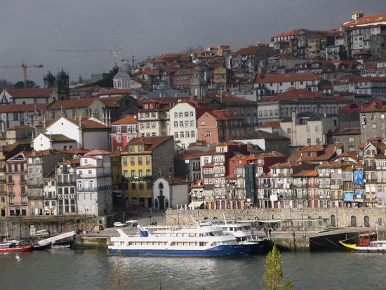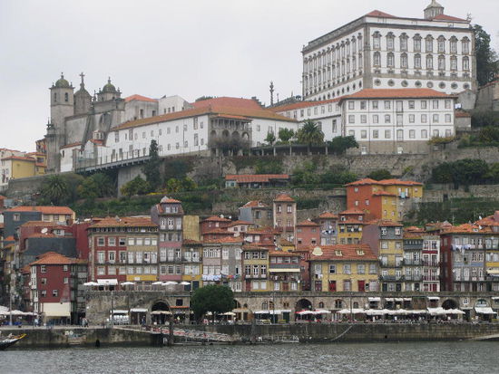 Am Fluss der malerische Cais da Ribeira mit bunten Fassaden mit bunten Fassaden, darüber türmt sich das dicht gestaffelte Bairro da Sé, dominiert von der trutzigen Kathedrale und dem kasernenartigen Bischofspalast.