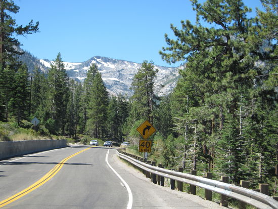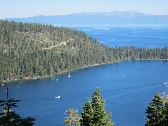 Langsam gehen wir zurück zum Hotel, setzen uns dort ins Auto und fahren in Serpentinen auf der 89 am Lake Tahoe entlang zur Emerald Bay, wo wir von einem Aussichtspunkt aus einen wunderschönen Blick auf die Insel und den in allen Blautönen schimmernden See haben.