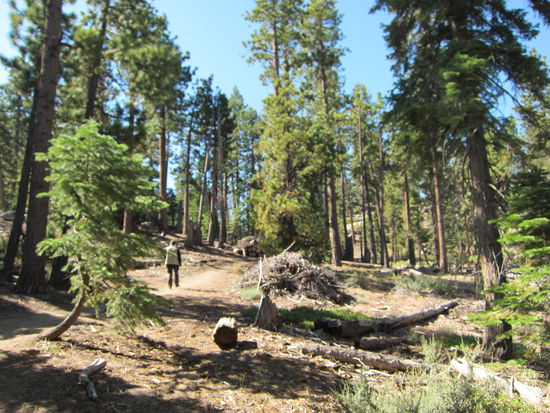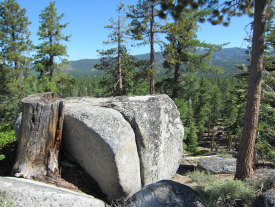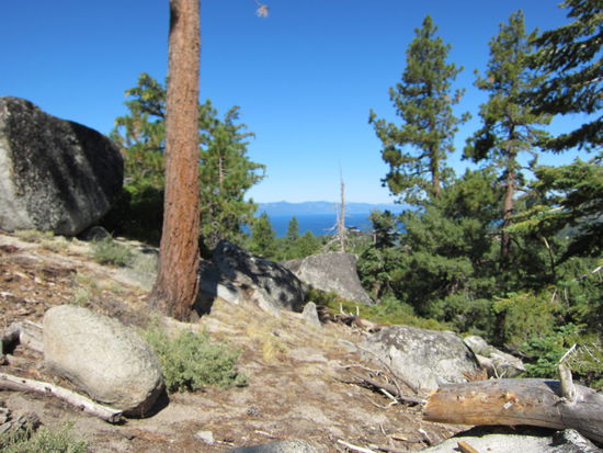 Noch kurz eincrèmen - mittlerweile sind es auch hier tagsüber ca. 28 Grad-, Rucksack mit Wasser und Notfallpack (Verbandszeug, etc.) füllen, dann wandern wir los. Es geht stetig bergauf. Irgendwie hatten wir uns den Trail schattiger vorgestellt. Es ist sehr heiß und die Sonne knallt, trotz der Nadelbäume. Es ist aber wunderschön. Um uns herum flüchten Streifenhörnchen in einem affenartigen Tempo. Thomas warnt lachend wie Doug Heffernan aus King of Queens vor "Giftsumach". Auf halber Strecke haben wir einen phantastischen Blick über die Baumwipfel hinweg auf den Lake Tahoe. Weiter geht's immer bergauf, bis wir zu einer Schneise im Wald kommen, an der ein Feuer die Bäume zerstört hat. Uns ist zu warm und den Gipfel müssen wir nicht unbedingt erklimmen! Also kehren wir um. Nach ca. 1,5 Stunden sind wir zurück am Parkplatz und löschen unseren Durst mit gekühlten Wassermelonenstücken.