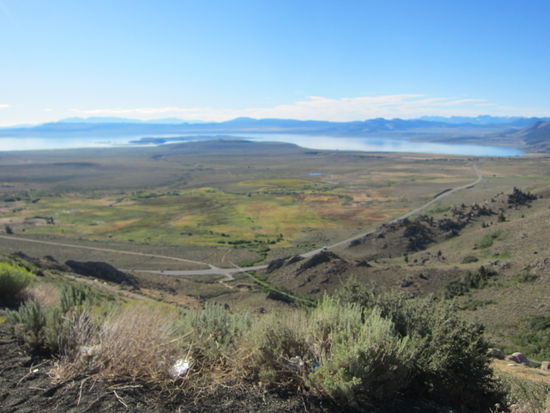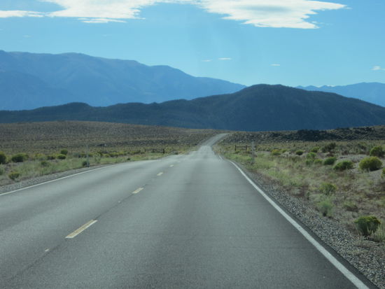 Um 5.30 Uhr stehen wir auf, wir sind sowieso wach und schwitzen. Um 6.15 Uhr füllen wir unsere Vorräte im Supermarkt auf, der schon offen hat und in dem mindestens 15 Angestellte fleißig Regale einräumen. Um 6.30 Uhr machen wir uns auf Richtung Las Vegas. Auf der 207 kurven wir uns durch Bergwälder und phantastische Aussichten auf die 395. In "Minden" (ja das heißt wirklich so wie die Stadt in Ostwestfalen-Lippe!) finden wir ein sehr gepflegtes Örtchen mit wunderschönen Ranches und Häuschen. In Bridgport tanken wir nochmal für teuer Geld (4,79 $ pro Gallone! - Am Lake Tahoe haben wir 3,59 $ pro Gallone bezahlt...). Hier ist es wieder sehr kalt - 7 Grad! Irgendwann passieren wir den Mono Lake und biegen gleich dahinter auf die 120, deren Zufahrt wir fast übersehen hätten. Diese Straße macht mich fertig! Zunächst an Nadelwäldern vorbei führt sie schließlich in die Wüste - und das auf welliger Fahrbahn. Die Wellen - "Dips" genannt - sind so groß bzw. tief, dass man sich fühlt wie in der Achterbahn. Mein Magen hüpft ungebremst nach oben und unten. Thomas muss teilweise das Tempo extrem abbremsen, damit das Auto (und ich...) nicht abhebt. Irgendwann landen wir auf der 6 und dann auf der 95. Eine sehr langweilige Wüstenstrecke durchs Niemandsland. Nur selten passiert man Siedlungen, die sehr verkommen sind. Auch Geister-Siedlungen findet man hier.