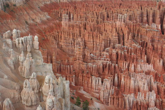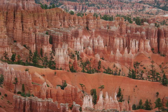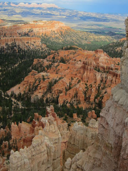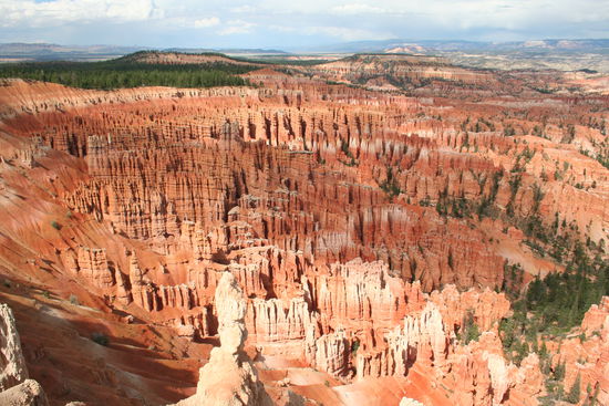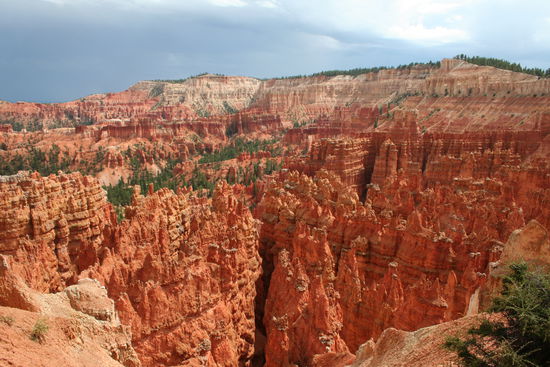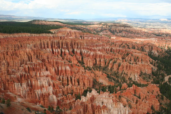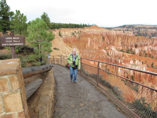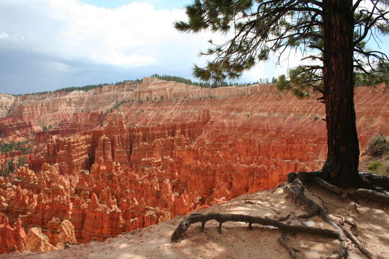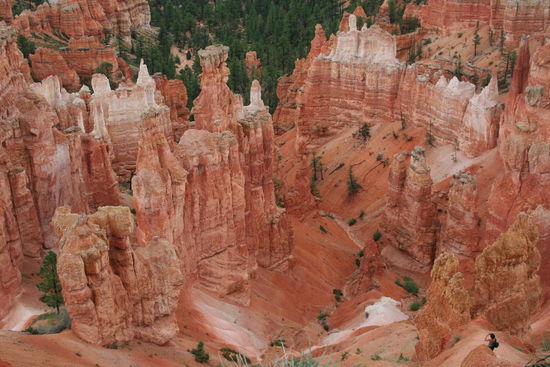 Wir setzen uns ins Auto und fahren zum Canyon und besuchen zunächst das Visitor-Center. Hier muss ich mich mal wieder schwer zurückhalten, um nicht den ganzen Laden leer zu kaufen... Stattdessen kaufe ich nur ein paar Magnete, ein Mouse-Pad und Postkarten. Als es nur noch tröpfelt, starten wir mit der Besichtigung des Bryce Canyons am Sunset Point (die Straße zum Sunrise Point ist leider gesperrt). Wieder einmal sind wir beide tief beeindruckt von den Formen und Farben des Canyons, obwohl wir doch inzwischen schon 3 mal hier waren! Mir ist der Rummel um den Grand Canyon völlig unverständlich, wo einen die Schönheit des Bryce Canyons doch so umhaut!
