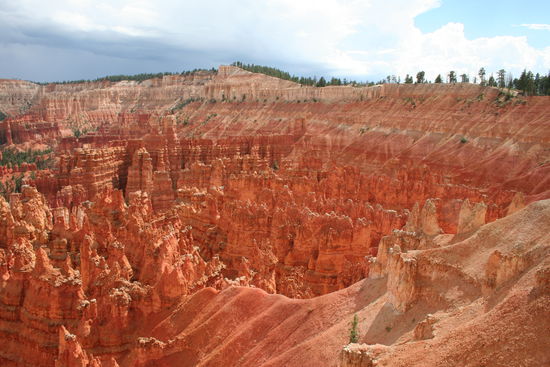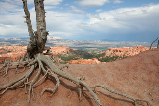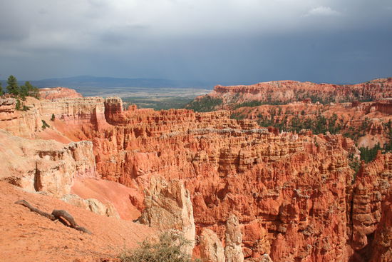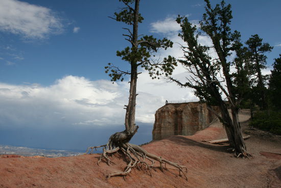 Ich wandere ein Stück den Navajo-Loop herunter - Thomas bleibt zurück. Wir wollen den Trail diesmal nicht wandern. Dafür ist es zu naß und teilweise sehr rutschig. Alle Wanderer, die mir entgegenkommen sind klitschnaß und bedeckt mit rotem Matsch. Also kehre ich um und gemeinsam wandern wir am Rim entlang bis zum Bryce Point. Nach jeder Biegung wirken die Hoodoos anders. Inzwischen scheint auch die Sonne wieder und in der Ferne sehen wir das Gewitter wegziehen. Ein toller Anblick!
