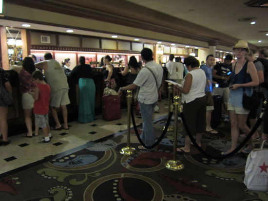 Die angebotene Zusatzversicherung lehnen wir freundlich aber bestimmt ab und dann können wir auch schon unser Auto, einen schwarzen Ford Escape, entgegennehmen. Eine Choice-Line gibt es hier nicht. Kurzer Test, ob alles o.k. ist, dann werden die Taschen eingeladen und los geht's Richtung Excalibur-Hotel. Dort suchen wir erst einmal längere Zeit einen Parkplatz und gehen dann zunächst nur mit unserem Handgepäck durch das wuselige Hoteltreiben zur Rezeption. Da stehen wir erst wieder mal in der Schlange. Hier ist die Hölle los. Dabei ist das Wochenende doch schon fast vorbei...!
