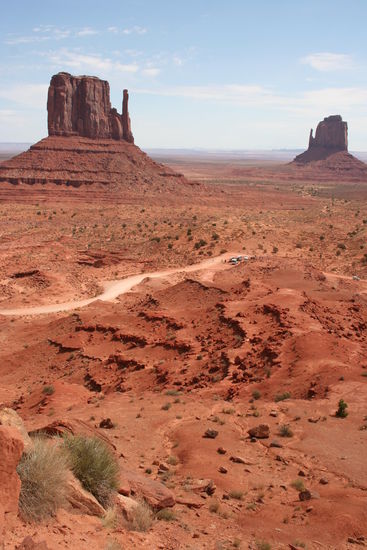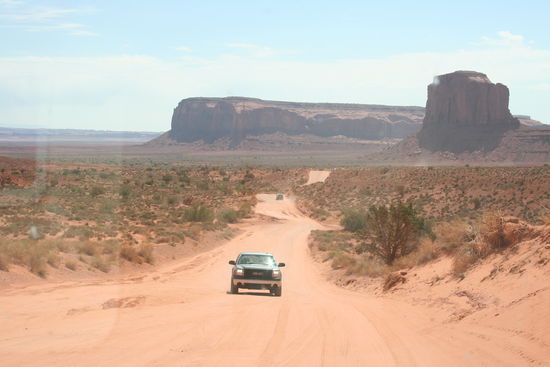 Am Monument Valley zahlen wir 10 $ Eintritt und machen am Visitor Center erst einmal Fotos von oben herab. Dann beginnt die Fahrt mit unserem Mietwagen durchs Valley. Vor 16 Jahren sind wir hier mit einem "normalen" Auto und nicht mit einem Geländewagen durchgefahren. Kaum vorstellbar... Thomas hat Spaß und gibt Gas! Wild werden wir auf der ungeteerten Holperstraße hin- und hergeschüttelt, vorbei an den berühmten Felsen.