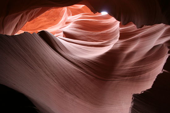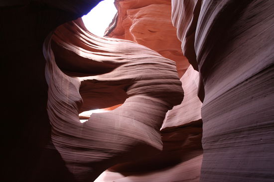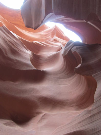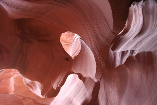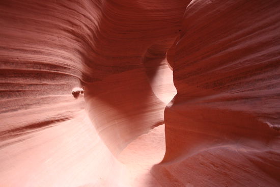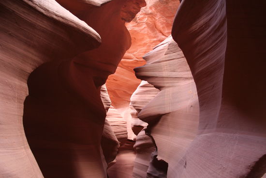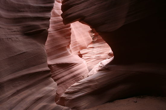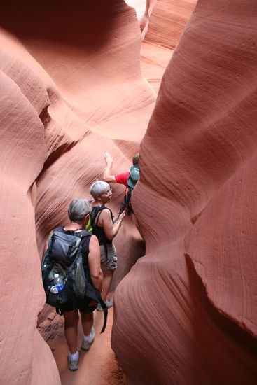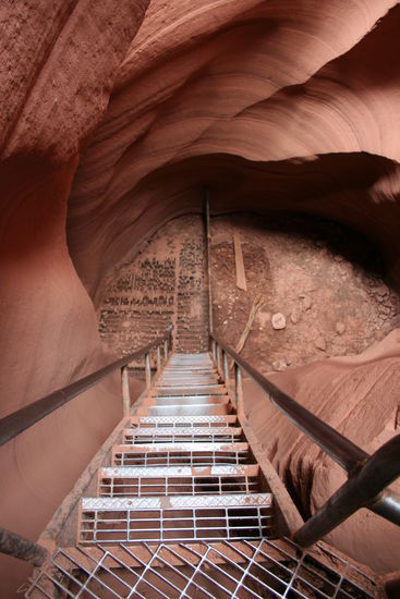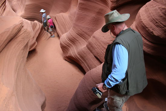 Wir haben Glück und können uns noch der Gruppe vor uns anschließen. Die geführten Touren starten halbstündlich. Der Canyoneingang besteht aus einer Felsspalte im Boden. Dort klettern wir alle nacheinander hinein. Zuerst haben wir Bedenken, ob Thomas mit seinen Körpermaßen dort hineinpasst, als wir dann aber den Navajo-Guide sehen, machen wir uns keine Sorgen mehr... Wenn der da durch passt, dann wir auch!