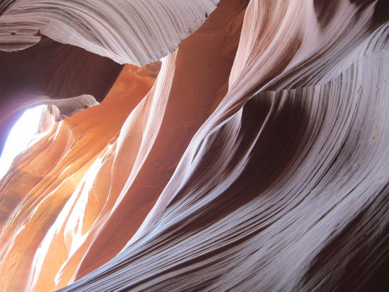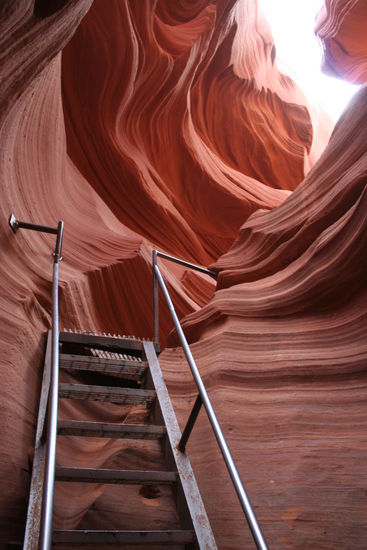 Trotzdem ist es ganz schön eng da unten - auch mit den vielen anderen Leuten. Thomas hat seine Platzangst aber gut unter Kontrolle. Die Canyonwände winden sich eng aneinander und lassen nur einen schmalen Gang zum Wandern. Zwischendurch muss man stählerne Treppen hinuntersteigen. Der Canyon ist wunderschön und man fühlt sich der Natur ganz nah. Alle machen hunderte Fotos von den Formen und Skulpturen, die der Canyon bildet. Auch wenn uns der Lower Canyon sehr gefällt, so fanden wir den Upper Canyon doch schöner und beeindruckender, weil dort die orange Farbe der Felsen noch viel intensiver war. Vielleicht liegt es aber auch am bewölkten Himmel, dass die Farben nicht so strahlen. Selbst als unser Guide Sand in die Luft wirft, um einen Spot im plötzlich auftauchenden Sonnenlicht zu erzeugen, wirkt dies nicht so toll. Aber egal. Schön ist es trotzdem. Die Tour dauert ungefähr 1 Stunde und 20 Minuten, dann sind wir am Ende des Canyons angelangt und steigen eine steile Treppe nach oben, um draußen am Canyon zurückzulaufen.