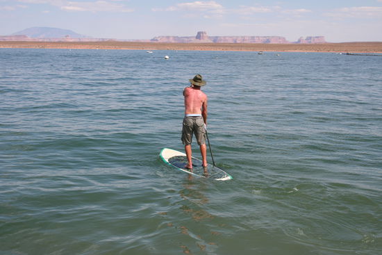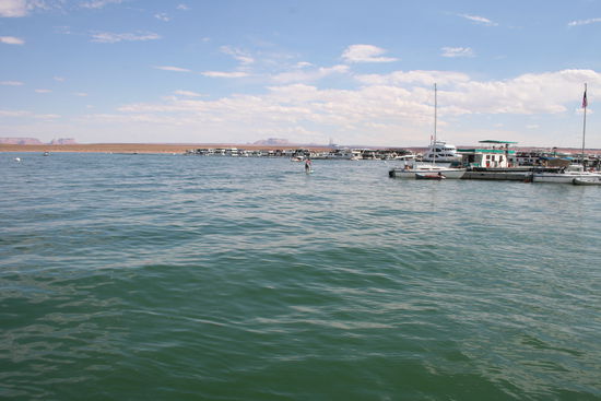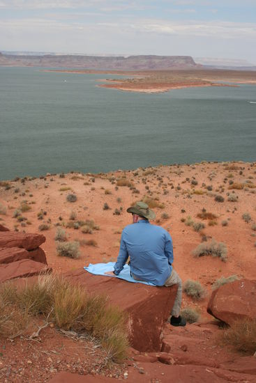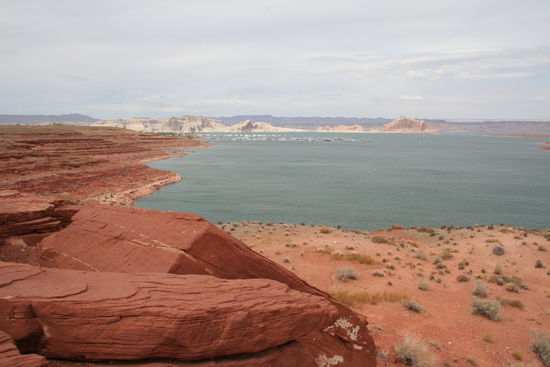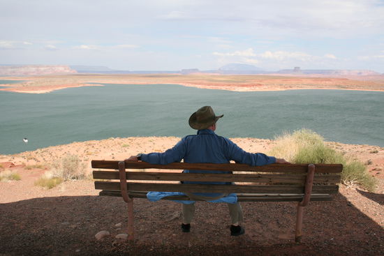 Am späten Nachmittag fahren wir dann nochmal zur Wahweap Marina und setzen uns auf "unseren" Felsen mit Blick auf den Lake Powell. Der Himmel ist wolkenverhangen. Um uns herum sehen wir Regenfronten, nur über uns sind noch einzelne blaue Stellen am Himmel. Und windig ist es! Wir fliegen fast weg. Es ist wunderschön hier!