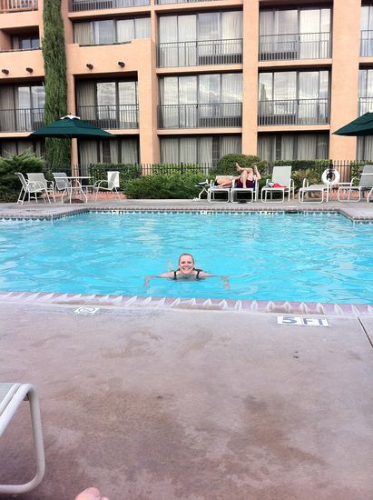 Tja, es kam, wie es kommen musste... Um 4.45 Uhr geht der Wecker. Ich frage Thomas, wie es ihm geht und er sagt "o.k." Als wir beide gerade angezogen sind, stürzt er zur Toilette... Er sieht wirklich elend aus! Ich gebe ihm zwei Imodium und ziehe die Reißleine. So hat das keinen Sinn! Wenn ihm im Auto auf dem Weg zur coyote buttes south (CBS) schlecht wird, oder er Durchfall hat, wird das für alle Beteiligten eine Tortur... Was tun? Es ist meines Erachtens noch zu früh, um die Dodsens anzurufen, also fahre ich den Laptop hoch und schicke eine E-Mail in der Hoffnung, dass sie diese noch rechtzeitig lesen... Danach gehen wir wieder ins Bett. Nachdem Thomas insgesamt 14 Stunden (!) geschlafen hat, wird er wach. Es geht im ein bißchen besser, es rumort aber immernoch in seinem Bauch. Wir betten uns um an den Pool und setzen uns in den Schatten und lesen für den größten Teil des Tages. Zwischendurch wasche ich zum letzten mal in diesem Urlaub unsere Wäsche. Thomas bekommt immer mehr Farbe ins Gesicht und schließlich fährt er los, um sich Brezeln und Cola zu besorgen. Eigentlich möchte er "was richtiges" essen, davon rate ich aber ab. Der Versuch ist gestern schon gescheitert.