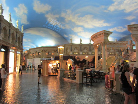 Boh, bin ich müde! Ich habe mal wieder schlecht geschlafen und bekomme meine Augen kaum auf. Für's Hotel-Frühstück sind wir schon zu spät dran (das gibt es nur von 7.00 - 9.00 Uhr), daher besorgen wir uns bei Vons Milch, Raisan Bran, Bagels, Philadelphia und Obst und frühstücken anschließend in unserer "Wohnung". Ich bin absolut antriebslos, aber Thomas hat Hummeln im Hintern, schließlich sind wir in Las Vegas. Recht hat er - also raffe ich mich auf. Wir parken unser Auto im Cesar's Palace und schlendern an den Forum Shops vorbei. Ich bin immer wieder beeindruckt von dem künstlichen Himmel. Er wirkt wirklich täuschend echt.