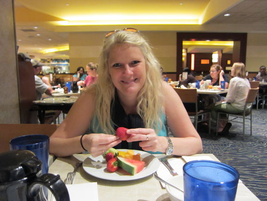 Dann geht's endlich los zu Harrah's. Ersteinmal verpassen wir die Einfahrt, also noch mal um den Block und nächster Versuch. Diesmal klappt's! Im Parkhaus stellen wir das Auto ab. Vor dem Hoteleingang finden wir auf einer Bank ein vergessenes, schönes weißes I-Phone. Ich nötige Thomas, es an der Rezeption abzugeben; er spart sich aber den Weg und gibt es einem uniformierten Security-Man. Ob der es wohl abgibt oder selbst behält? Ich habe ein schlechtes Gefühl... Nach einiger Suche finden wir das Buffet, zahlen 16 $ pro Person und finden uns im Schlaraffenland wieder! Wir könnten uns reinlegen ins Essen! Leider haben wir jeweils nur einen Magen, daher essen wir Breakfast-Potatoes, Eier, Bacon-Strips, seeehr leckere Rolls (fast so lecker wie im Red Lobster!) und Obst. Danach platzen wir fast, strahlen aber wie die Honigkuchenpferde. Wir sind wieder im Land unserer Träume!