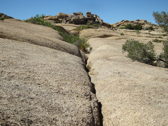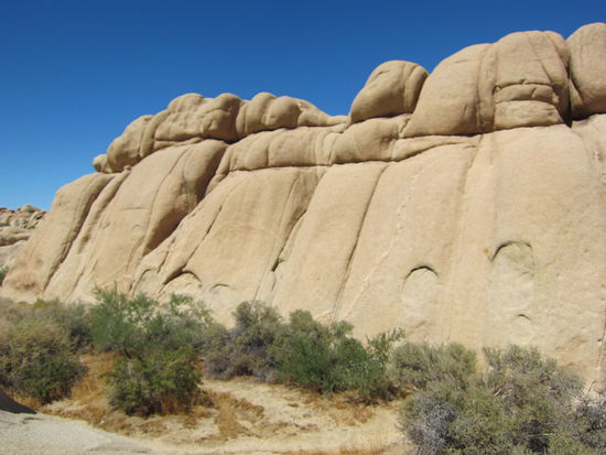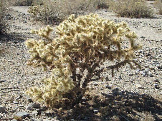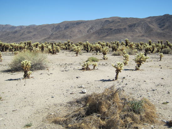 Nachdem wir schön durchgegrillt sind, zieht es uns zurück ins klimatisierte Auto. Es geht weiter Richtung südlichem Parkausgang. Das Satellitenradio berieselt uns mit alten amerikanischen Klassikern. Die Fahrt zieht sich, auch wenn die Wüstenvegetation sich ständig verändert. Mal Joshua Trees, mal buschige Kakteen, mal felsige Berge, mal Smoke Trees, mal hohe strauchartige Kakteen. Zwischendurch gibt es "Washes", an denen man sieht, wie hier Wasser in Sturzbächen aus den Bergen über die Straße geflossen ist.