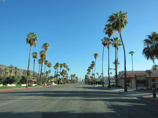Irgendwann haben wir die 10 erreicht. In Coachilla verlassen wir die Autobahn. Obwohl ich mir nicht sicher bin, ob dies die richtige Abfahrt ist, um die 111 nach Palm Springs zu erreichen.... Doch ist sie! Gleich nach (!) der Abfahrt ist ein Wegweiser. Das bleibt leider der einzige. Von nun an irren wir durch Indio und an protzigen Privat-Wohnanlagen mit üppig bewässerten Grünanlagen vorbei. Immernoch kein Schild, das uns den Weg zur 111 weist.... Wir orientieren uns an der Himmelsrichtung und Thomas meint großspurig: "Wir sind richtig - die Berge da hinten kenne ich!". Blödsinn! Stattdessen fahren wir einmal einen riesen Bogen und fragen irgendwann einen neben uns stehenden Autofahrer nach dem Weg.