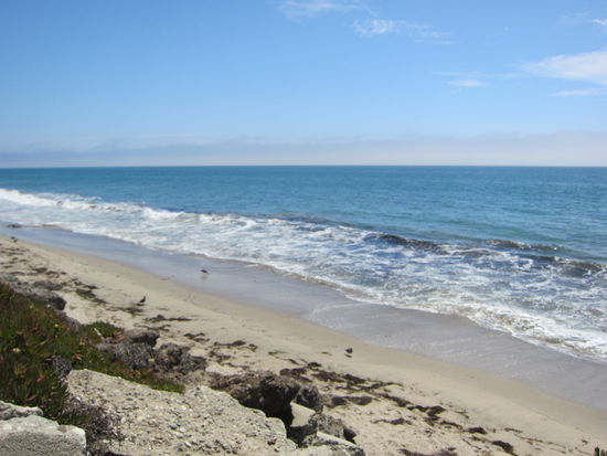 Weiter nördlich wird es dann wieder wärmer und die Sonne ist auch wieder da. Die 101 bietet immer wieder schöne Blicke auf Strand und Meer. Auch ein paar Surfer sieht man. Leider ist das Halten sehr schwer, da wir auf der "falschen" - dem Meer abgewandten - Straßenseite Richtung Norden unterwegs sind und die Parkstreifen auf der anderen Seite liegen. Irgendwann machen wir einen U-Turn und parken (wie viele andere auch) verbotener Weise auf dem Seitenstreifen. Dort setzen wir uns auf die Düne und essen unsere Sandwiches mit Blick auf das Meer und den Strand. Sehr schön! Pelikane und Möwen fliegen in Formation direkt über unsere Köpfe hinweg.