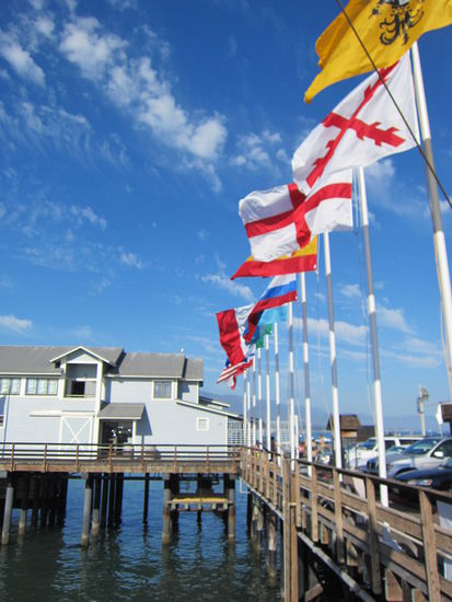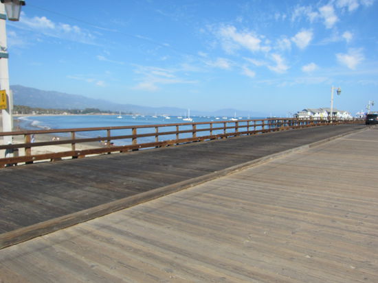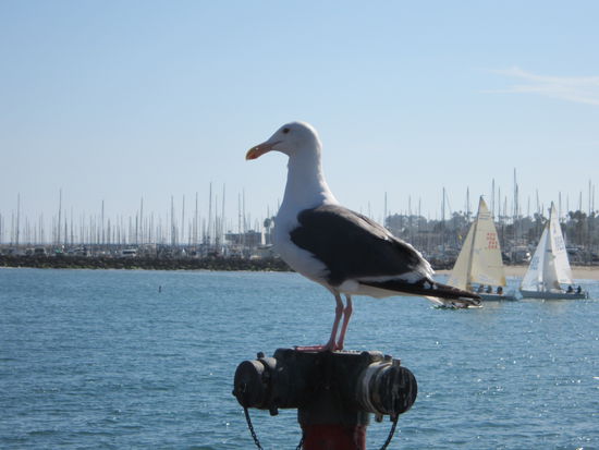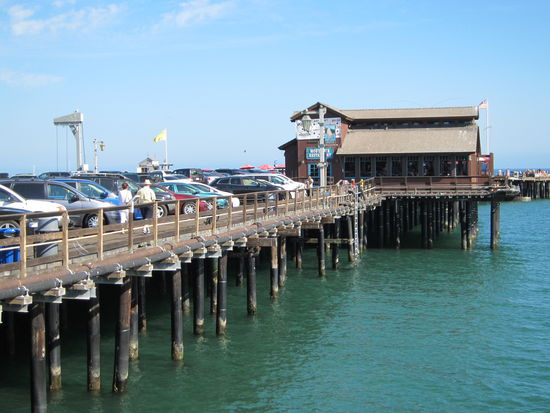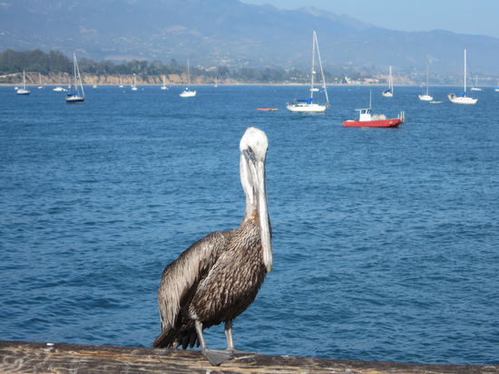Weiter nördlich erscheinen immer mehr Obst-Plantagen. In Goleta finden wir schließlich unser Motel Super 8 und checken ein. Ein großes, sauberes Zimmer. Geht doch (Ist allerdings auch das teuerste Zimmer unserer Reise) ! Wir bringen unsere Taschen auf's Zimmer, dann steigen wir direkt wieder ins Auto, tanken und fahren zurück auf der State nach Santa Barbara. Diese führt uns direkt durch die Old Town und an süßen Geschäften und Restaurants vorbei zum Meer. Dort parken wir unser Auto für 2 $ pro Stunde auf einem Parkplatz direkt am Strand und gehen auf den Pier. Hier ist es wunderschön. Die Sonne strahlt, es sind angenehme 25 Grad, die Pelikane und Möwen sitzen direkt auf dem Pier und lassen sich fotografieren, die Boote ziehen an uns vorbei und wir beobachten wie ein Junge eine King-Crab aus dem Meer angelt.