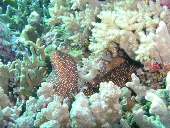 Vom Erlebnis unseres wahrscheinlich besten Tauchgangs hier haben wir leider keine Bilder. Aber an einem Tag hatten wir wahnsinnig Glück - und haben eine fast 3 Meter große Seekuh (!), einen großen Adlerrochen, einen Hai, Thunfische, Napoleonfische und alles was das Taucherherz begehrt gesehen!