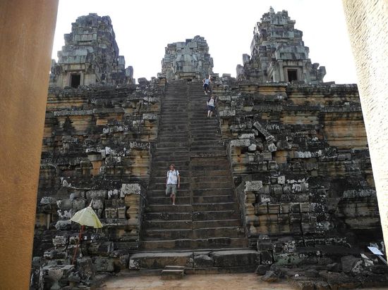 Zum Schluss noch Haben wir dann noch den Ta Keo angeschaut. Als ich den Tempel da so sah, dachte ich zuerst an die Maya's und ihre Pyramidentempel. Eine gewisse Ähnlichkeit ist nicht abzustreiten. Über etliche, äußerst steile Stufen ging es dann hinauf zu den fünf Türmen. Der mittlere und höchste Turm verlangte nochmal etwas Kletterei ab und belohnte aber mit einem herrlichen Ausblick über die Anlage und den wilden Dschungel.