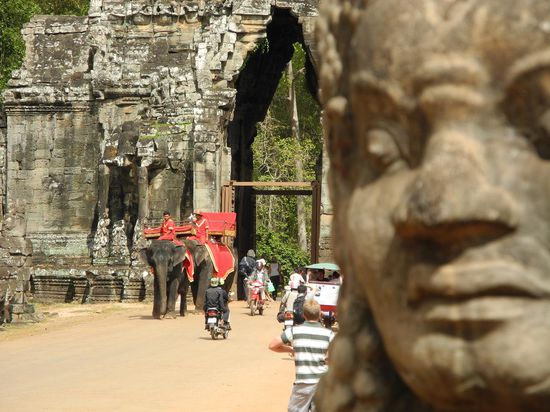 Von hier aus hieß es dann auf dem schnellsten Weg zurück, da es schon zu dämmern begonnen hatte. Durch die Anlagen von Ankor Thom zurück nach Siem Reap wo uns die Dunkelheit und die maximale Verkehrsdichte endgültig eingeholt hatte.