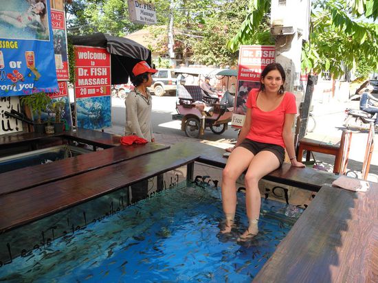 Heute alles nur kein Tempel mehr. Langsam sollten wir uns auch mal um die Weiterfahrt kümmern. Nach langem hin und her, haben wir und dann doch für den Nachtbus nach Sihanoukville entschieden. Das heißt wir haben noch Zeit bis Mitternacht um abermals über die Märkte zu schlendern, exotische Köstlichkeiten zu probieren und entspannende Massagen zu genießen. Bei strahlend blauem Himmel ohne ein Wölkchen oder Lüftchen und gefühlten 40C wäre ein Bad in einem Pool auch noch ne Option gewesen aber leider verfügt unser Hotel nicht über diesen Luxus. So ließen wir uns zu einer Fish-Massage hinreißen. Ein überdimensionales Aquarium voll mit Hot Spring Fishes, in dem man für 15 - 20 min die Füße badet. Kaum sind die Füße im Wasser kommen die Fischschwärme und beginnen die alten Hautschuppen von den Füßen abzunagen.
