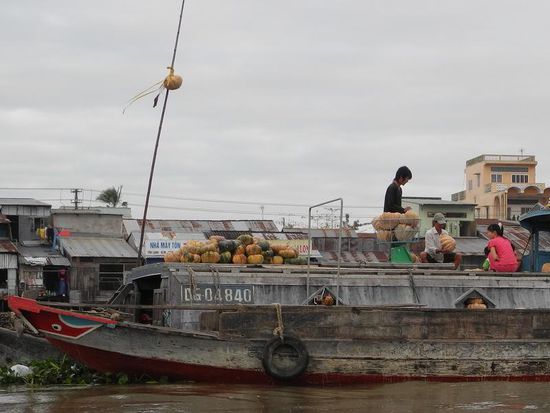Wir treiben schon langsam Stromabwärts, als unsere Bootsführerin ein Bündel Bananen und zwei Baguette nach vorne reicht. Das Frühstück ist somit komplett. Hinter uns beginnt mit einem mal das knattern des Außenborders. Wir korrigieren unseren Kurs und fahren auf einem Seitenarm des Mekong flussaufwärts zum schwimmenden Markt Cai Rang. Auf diesem Markt treffen sich die Großhändler. Die kleinste Menge die man hier kaufen kann ist ein Kahn voll. Jedes der Schiffe die hier vor Anker liegen hat jeweils nur eine Frucht oder Gemüsesorte geladen. Kenntlich gemacht wird dies durch ein Exemplar das am Fahnenmast hochgezogen wird.