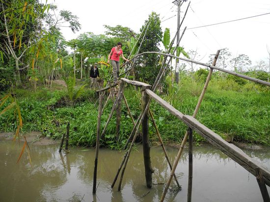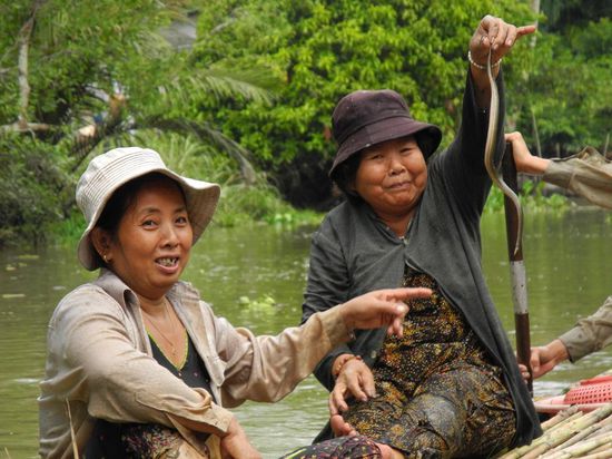 Auf dem kleineren Markt angekommen, kaufen wir eine Wassermelone für umgerechnet 0,20€ / kg. Unser Guide schneidet uns noch eine Pampelmuse auf, die zu meinem Erstaunen nur leicht säuerlich aber dafür sehr saftig und erfrischen schmeckt. Jetzt biegen wir endlich in einen der schmalen Kanäle ab. Die Stadt haben wir längst hinter uns gelassen und am Ufer der Kanäle, die Wild verzeigt und ohne System angelegt erscheinen, sind die Häuser und Hütte der Bauern zu sehen. Plötzlich geht der Motor aus und als dieser auch nicht mehr angeht, wird der Schlangenhexler aus dem Wasser gehoben. Sofort ist die Ursache für das Malheur zu sehen. Mehrere Plastiktüten hatten sich so zwischen Welle und Schraube verheddert, dass der Motor abgewürgt wurde.