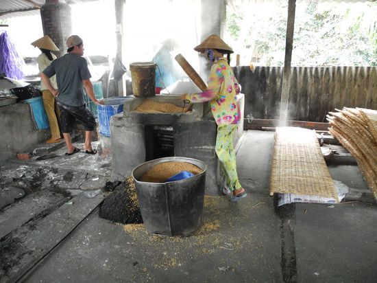 Auf dem Wasser geht es aber mindestens genau so chaotisch zu wie an Land. Alle Boote fahren kreuz und quer, wobei auch hier die Regel gilt, je größer desto vorfahrt. Schiffe werden so überladen, dass die Reling schon in Wasser steht und beim Beladen wird Kammer für Kammer von hinten nach vorne gefüllt, so dass der Eindruck entsteht, man wolle das Schiff versenken. Plötzlich biegen wir in einen schmalen Seitenkanal ein, wo wir einen kurzen Stopp einlegen, um eine Reisnudelfabrik zu besichtigen. Die Produktionsstätte ist mindestens so einfach wie das Produkt selbst. Reis wird gemahlen und mit Wasser zu einem Teig verarbeitet. Auf zwei großen Platten wird der Teig nun zu einer Art Crêpes verarbeitet. Der Ofen darunter wird mit der Reisspreu angefeuert. Bevor die Faden noch geschnitten werden, müssen sie noch 4h in der Sonne trocknen.