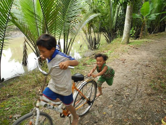 Heute steht mal wieder ein Ortswechsel an. Nach langem Überlegen haben wir uns schließlich für ein Städtchen Namens Tra Vinh entschieden, welches noch tiefer im Mekong-Delta liegt. Der Hausherr von unserem Guesthouse kennt da auch einen Busfahrer, der jetzt sofort los will. Ein Telefonat und schwups, stehen zwei Motorradfahrer vor der Tür. Schnell noch die 200.000 VND für den Bus bezahlt und schon geht es los, durch den chaotischen Verkehr der Großstadt. Ich bin mir mit meiner Größe und dem Gewicht meines Rucksacks durchaus bewusst, dass ich mit der geringsten Gewichtsverlagerung, unseren Kurs gefährlich verändern kann. Also ist stillhalten angesagt, was mir überhaupt nicht leicht fällt, als wir mit Vollgas auf die Linksabbieger, die schon mitten auf der Kreuzung sind zufahren. Was tun? Mit einem kleinen Schwenker nach rechts mich und den Fahrer in Sicherheit bringen oder einfach vertrauen.