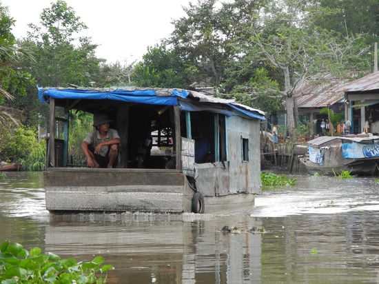 Der kleine Spaziergang war schnell vorbei und wir haben uns wieder auf unsere Plätzen gesetzt, als vor uns so etwas wie ein Stau zu sehen war. Jetzt gibt es Mittagessen verkündet unser Guide und das was da vor uns wie ein Stau aussieht ist die Anlegestelle von dem kleinen Restaurant, das ist schon voll besetzt mit Touristen. Wir staunen nicht schlecht als wir auf den Rückweg wieder stromaufwärts fahren. Unser Guide kann uns zwar nicht genau sagen, wie weit wir vom Meer entfernt sind, aber er ist sich sicher, dass es mit der Flut zusammenhängt, die ins Delta drückt. Ich nötige ihn eine Schätzung abzugeben. Mit seinen 150-200 km liegt vermutlich garnicht so schlecht. Und so geht es im selben Schneckentempo zurück stromaufwärts. Immer gegen den Strom und doch nur im Kreis bewegt. Jedenfalls haben wir so noch genügend Zeit die Menschen am Fluss etwas genauer zu beobachten.