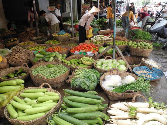 Heute heißt es erst mal ausschlafen. Kurz über den Markt das Frühstück holen. Der Roomservice bringt den Kaffe und den Tee auf die Dachterrasse, wo wir Bananen, Mango, Wassermelone und Ananas schon in mundgerechte Stücke zerlegt haben. Lecker. Hmmm ... aber so ein Stück Käse auf dem weichen Baguette wäre auch mal wieder nett und vielleicht sogar noch ein Rädle Wurscht ... Und so starten wir die Mission Vesper. Gurke, Tomaten und ein Rettich sind auf dem Markt schnell gefunden. Ebenso eine Kunststoffbox mit Deckel.