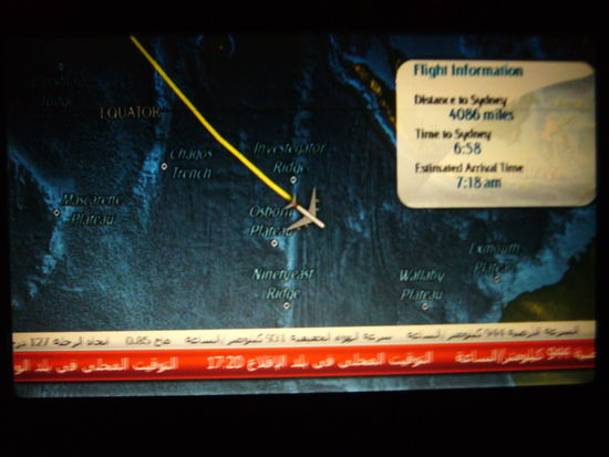 Kurz vor unserer Zwischenlandung in Sydney die Weltsicht, wo gerade die Sonne scheint und wo's gerade dunkel ist.