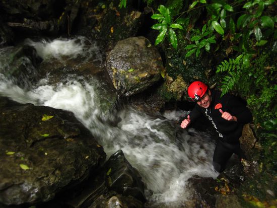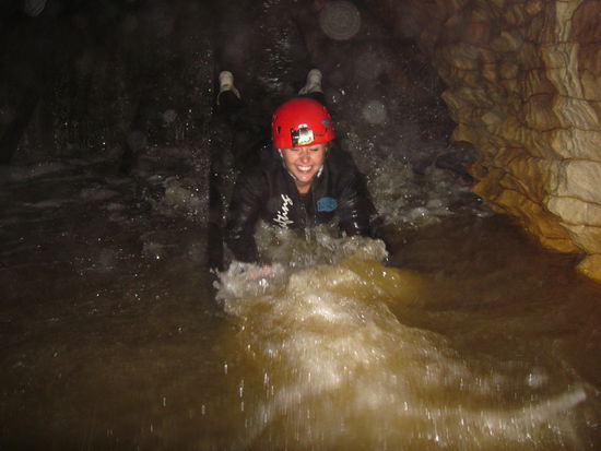 Mit dabei waren 35 Meter Abseilen senkrecht nach unten in ein dunkles Loch, eine Fahrt mit dem Flying Fox in die Dunkelheit, ein Sprung ins ca. 5 Grad kalte Wasser mit nem Gummireifen, Treiben lassen durch die Gluehwuermchen-Hoehle, eine Wanderung durch das unterirdische Hoehlensystem (inkl. Tanzeinlagen, damit uns warm wird) sowie das Verlassen der Hoehlen, wo wir durch 3 Wasserfaelle hinaufgestiegen sind.