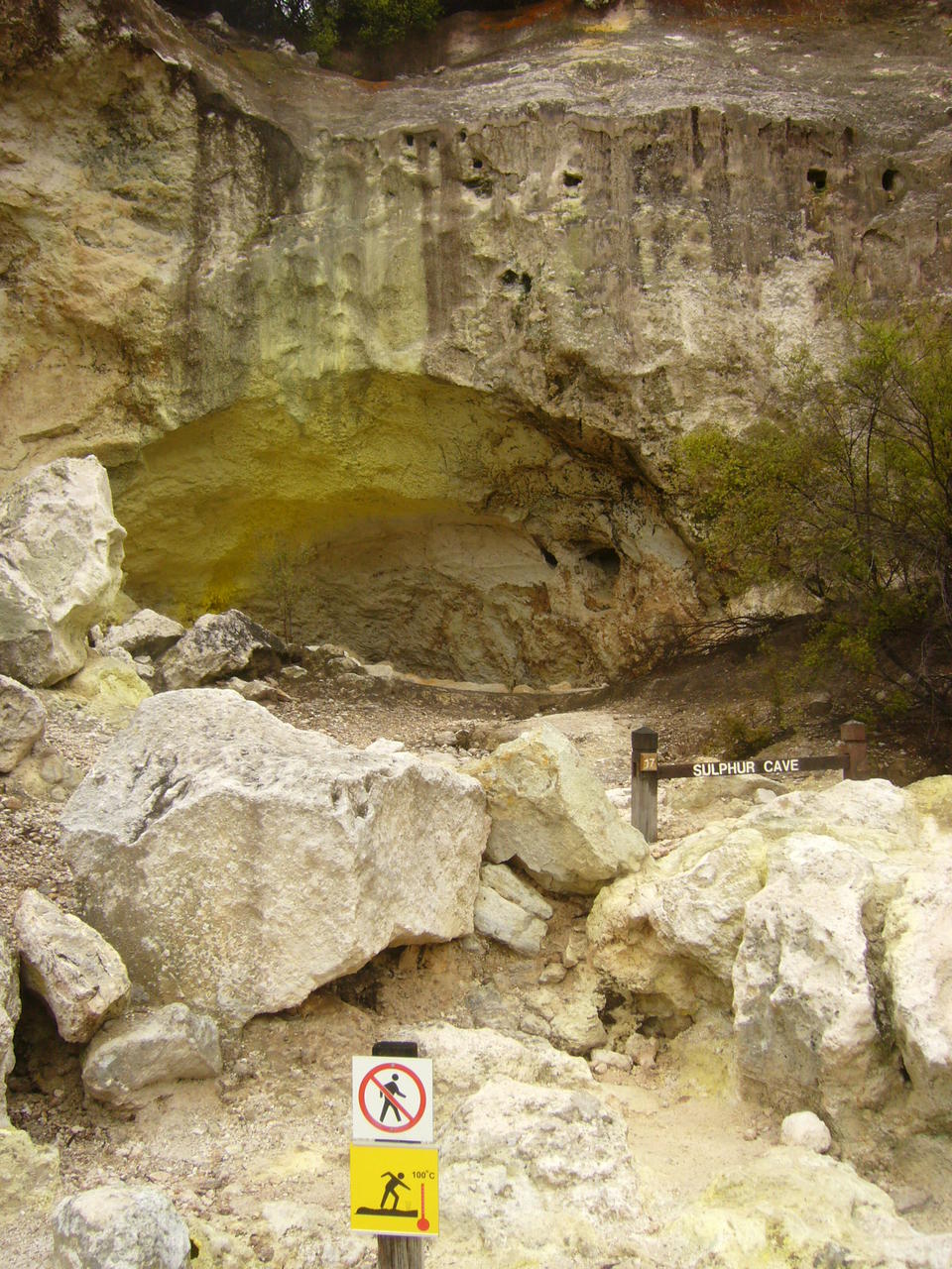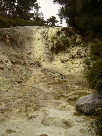 In fast allen Quellen spielt Schwefel eine Rolle. Pur leuchtend gelbe Ablagerungen, vermischt mit Arsen gruene.