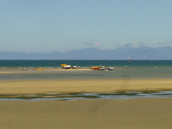 Als wir zurueck am Strand waren, sind wir mit dem Boot direkt auf diesen Anhaenger gefahren und anschliessend mit dem Traktor an Land gezogen worden. Da naemlich grad mal wieder Ebbe war, waren wir rund 100 Meter von der Strasse weg.