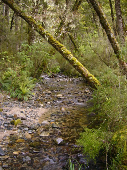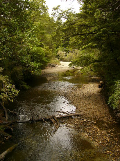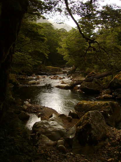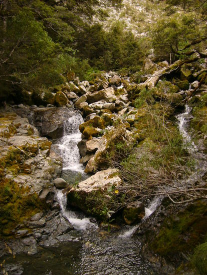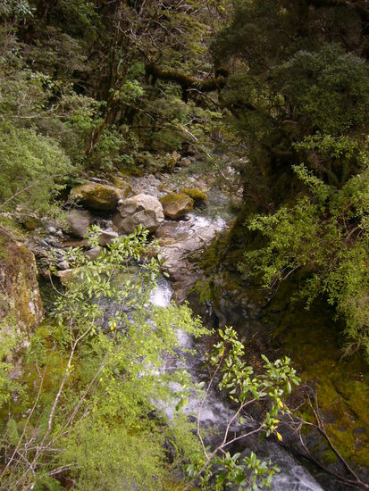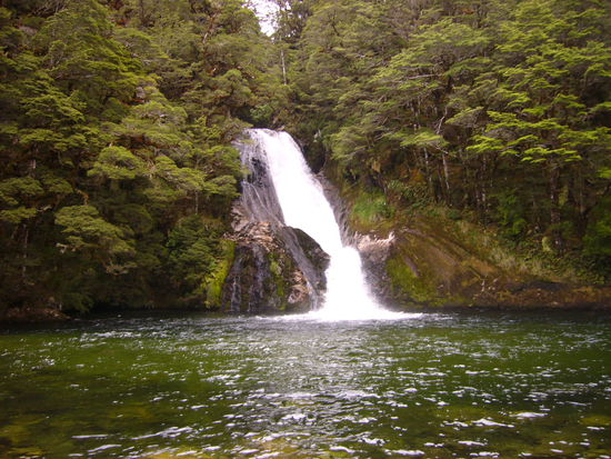 Und hier noch der Wasserfall in der Naehe unserer 2. Huette, bei dem man sofort von einer Wolke von Sandflies umgeben war, sobald man stehen geblieben ist. Deshalb waren wir da auch nicht lang und Manu war nicht im Wasser...