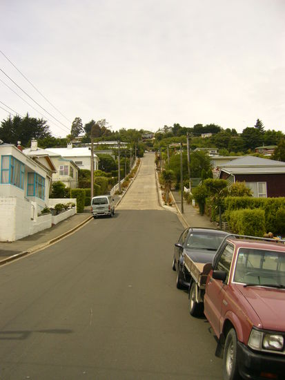 Und die laut Guiness Buch mit einer Steigung von 38 % steilste Straße der Welt, die Baldwin Street, sind wir natürlich auch rauf und wieder runter gefahren. Vom Gefühl her war's ähnlich wie im Silver Star in Rust (Manu hat vom Gesichtausdruck her auch fast genauso geschaut ), und unsere kleine japanische Reiserakete mit gefühlten 35 PS musste alles geben, dass wir raufgekommen sind.