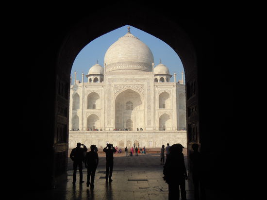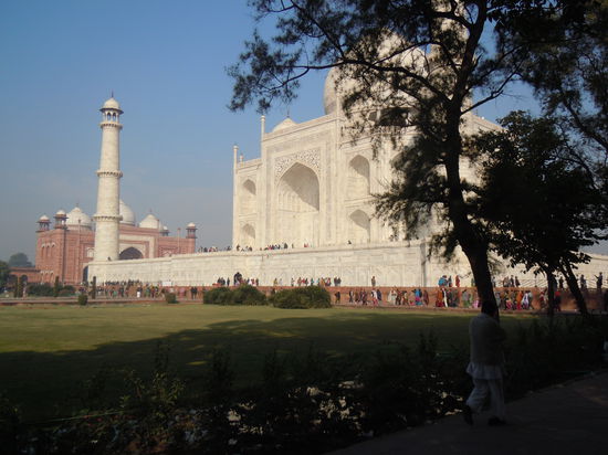 Kurz vor 'unserem' Hotel konnten wir gestern in der Abenddämmerung vom Taxi heraus schon einen Blick auf das berühmte Taj Mahal erhaschen. Leider entspricht der Ort (Agra, und nein Fenschi, es heißt nicht Agrar ) um dieses Baudenkmal herum genau den Beschreibungen meines Reiseführers: laut, chaotischer Verkehr, dreckig, ziemlich groß, ohne wirkliches Zentrum. Deshalb kommen die meisten Reisenden als Tagestouristen hierher. Wir zum Glück nicht, so dass wir heute Morgen schon früh und ohne langes Warten das Areal betreten konnten. Wie unten zu sehen kann das im Laufe des Tages länger dauern, da die Sicherheitsvorkehrungen denen eines internationalen Flughafens in nichts nachstehen.