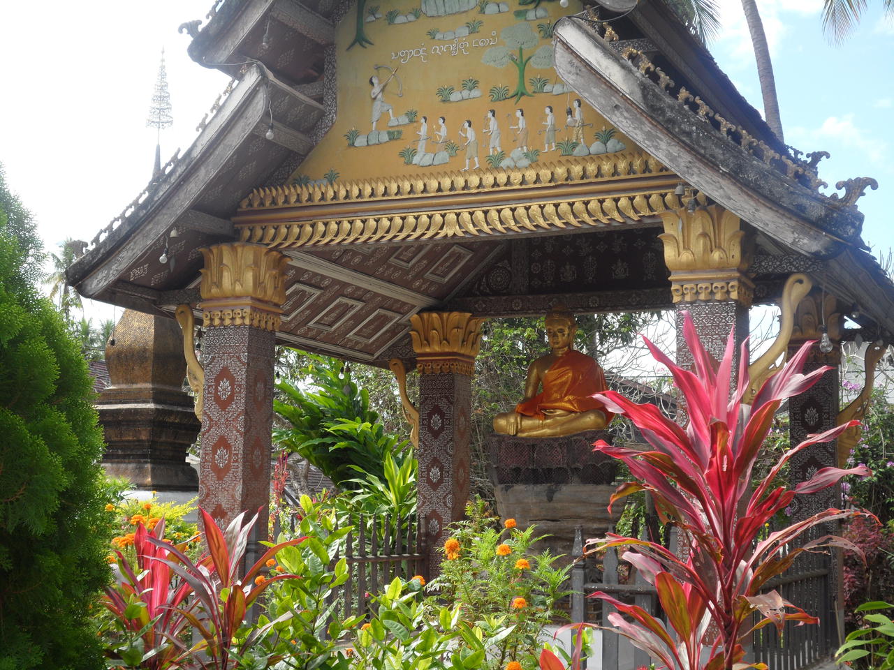 Also bin ich dann um 11 Uhr ganz entspannt zum ersten Vat (= Tempel) gelaufen. Er ist gleichzeitig der aelteste erhaltene Vat in Luang Prabang und wirklich unglaublich schoen. Dazu muss man wissen, dass es hier unzaehlige Vats gibt, viele davon werden noch tatsaechlich als Kloster betrieben. Ich hatte Glueck (wahrscheinlich weil es Mittagszeit war) und es waren nur wenige Leute da. Ich erspare jetzt die Einzelbeschreibungen der Gebaeude und Buddha-Statuen, das kann man in viellen Reisefuehreren etc. besser nachlesen. Auf jeden Fall hatte ich mich etwas abseits in den Schatten gesetzt und das Treiben beobachtet, als ein kleiner Moenchnovize zu mir kam und mich bat mitzukommen. Er fuehrte mch zu einer Gruppe von jungen Moenchen, die kicherten und schnatterten und mich angrinsten. Sie wollten sich einfach nur unterhalten und dabei ihr englisch aufbessern (ich glaube das war eine Art Hausaufgabe fuer sie) und weil ich allein unterwegs war, haben se sich halt getraut mich anzusprechen. Es war klasse, wir haben uns im wahrsten Sinne ueber Gott und die Welt unterhalten und spaetestens als sich mich auf 25 schaetzten und fragten, was ich denn gerade studiere, waren sie meine Helden Die Moenchnovizen der verschiedenen Kloester gehen auf eine spezielle High School hier und ist eine Ehre, dort aufgenommen zu werden. Entsprechend sind die (mehrheitlich) Jungs aus den verschiedenen Regionen zusammengewuerfelt, einige erst frisch und mit entsprechend Heimweh dabei. Sie stehen morgens schon um 4 Uhr auf, beten und machen dann die Gebaeude sauber. Anschliessend gehen sie gegen 6 Uhr durch die Stadt und werden von den Einheimischen mit Essen beschenkt. Dann gehts zur Schule, dann gibts Freizeit und dann wird wieder gebetet. Wir haben fast eine Stunde geschnackt und hatten wirklich viel Spass. Ich soll morgen gegen 6 Uhr an der Strasse stehen... hmmm...
