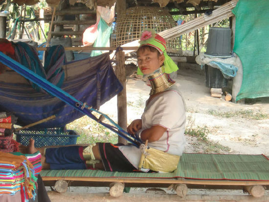 Im Long-Neck-Village könnten wir goldene Halsringe erwerben, die die Trägerin vor den Bissen wilder Tiere schützen sollen. Ich habe Mascha ein Paar angeboten aber sie lehnte dankend ab. Schließlich gehört die Hausspinne in der Küche nicht zu den gefährlichen Arten die jemanden an den Hals gehen.