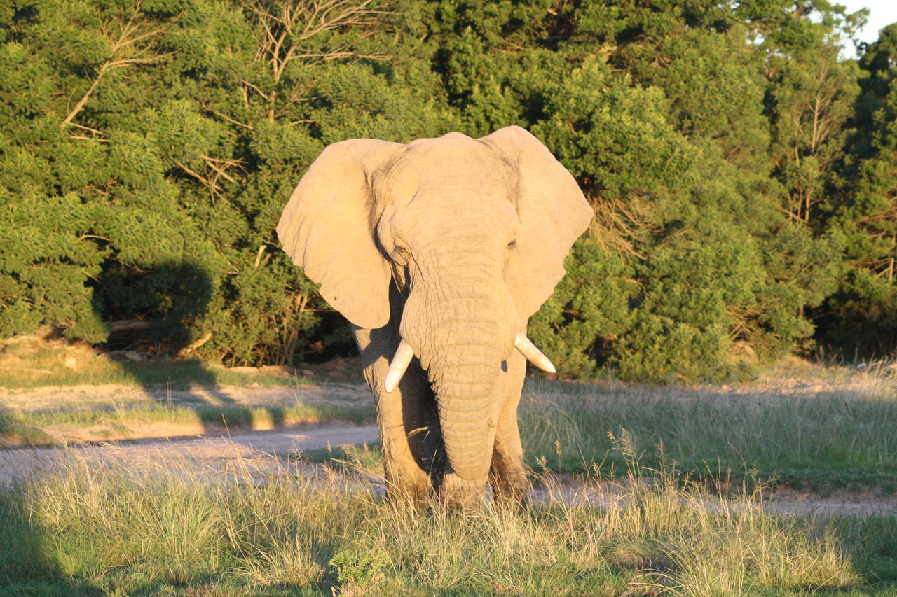 Schon gleich zu Beginn bekamen wir Weißschwanzgnus, Oryxe, Zebras, Spring,- Bleich- und Blessböcke zu sehen, aber ich merkte schon bald, dass Ashley sich damit nicht allzu lange aufhalten wollte. Er hatte ein Ziel: Elefanten oder zumindest den ältesten (und mächtigsten) Bullen des Reservats. Diesen "Herrn" sollten wir im Laufe der Tage noch etwas besser kennenlernen. An diesem ersten Abend machte er aber einen recht ruhigen, ausgeglichenen Eindruck auf mich, während er da im Sonnenuntergang stand und vor sich hin fraß.