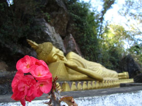 Die Umgebung von Luang Prabang lädt zum Radfahren ein, also fahre ich mit dem Mountainbike zur mit hunderten von Buddhas bestückten Höhle bei Pak Ou. Die Höhle selbst ist nicht allzu groß und man ist schnell durch. Mich hält, als ich zurückfahren will, eine Horde von Kindern auf. Ich parke ja mein Rad nicht immer am Parkplatz, weil dafür muss wieder und wieder extra gezahlt werden, also dafür dass die Wächter auf ein angekettetes Rad aufpassen! Die Kinder hatten es entdeckt und bewunderten es offensichtlich. Die großen dürfen alleine eine Runde fahren, die kleinen begleite ich und wir haben eine Menge Spaß. Ich verabschiede mich schon dreimal und immer heißt es von neuem "excuuuuuuuuuse me, miiiiiiiiiisss, babyyyyyyy again!" . Ich bin echt schlecht im Nein-Sagen, wenn mich derart große, braune Kulleraugen ansehen! Ein langer, schöner und anstrengender Ausflug.