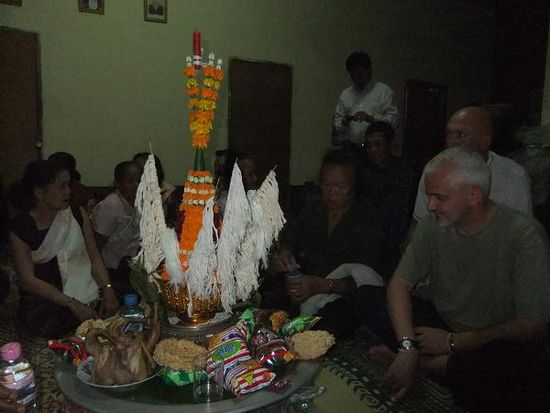 Am Abend traffen wir uns dann mit Loon und gingen zusammen mit anderen 4 Falangs die wir unterwegs traffen zu dieser Feier. Die fing in einem Raum der fast voller Laoten war. Auf der einen Seit sassen die Frauen und auf der andern die Maenner . In der Mitte befand sich ein 'Tischchen '( Ich weiss nich wie man das nennt) mit Essen, Blumen und Baumwollarmbaendchen. Es wurde ruhig und ein Mann began laut zu beten, danach fasten wir alle den Tisch an, er sagte was kurzes und begann wieder an laut zu beten. Er hoerte nicht mehr auf. Die Farangs schauten sich gegenseitig an. Er betete und betete. Und ploetzlich schlug mich eine alte Frau, die neben mir sass, mit voller wucht auf den Oberarm. Es hat richtig gekloepft! Ich hatte schon Angst, dass ich was falsches gemacht habe. Ich schaute sie an und sie fing an zu lachen(der Mann war immer noch am beten). Ich schaute auf meinen Oberarm und sah eine tote blutverschmierte Muecke. Ich schaute die Frau an die immer noch am lachen war und fing auch an zu lachen. Ich konnte nicht mehr aufhoeren und sie auch nicht. Und das alles waehrend des Gebetes.