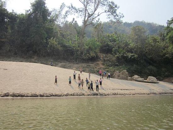 Am naechsten Tag standen wir frueh auf um noch ein paar Suessigkeiten fuer die Kinder zu kaufen und um Hotel zu waechseln. Danach traffen wir uns mit den Franzosen und fuhren 4 Stunden den Mekong rauf. Die Kinder wussten, dass die Franzosen kommen wuerden und warteten geduldig am Strand des Mekongs auf sie. Dort angekommen tobten sie umher als sie uns sahen und schauten uns alle mit riesigen Augen an. Es war eine/r schoener und suesser als der andere oder die andere. Die Franzosen zeigten und das Dorf und die Schule. Mittag assen wir mit dem Direktor und den Lehrern. Nach dem Essen spielte ich mit einer Lehrerin und ihren Schueler ein Spiel, dass ich fuer sie mitgebracht habe. Ein Wuerfelspiel, dass aus Schweinchen besteht. Je schwerer die gewurfelte Position desto mehr Punkte. Danach tobte ich mit einpaar Kindern auf den Pausenhof umher. Waehrend dessen Emma im Schulzimmer die Kinder unterrichtete. Was fuer ein Anblick: Emma neben der Wandtafel und der Raum gefuellt mit Kinder, die auf den Stuehlen und Tischen standen. Die Blicke alle auf sie gerichtet. Sie sagte etwas auf englisch und danach das gesamte Klassenzimmer im Chor nach. Ich und Jordi bekamen unser Mund nicht mehr zu. Als letstes verteilten wir noch unsere Suessigkeiten. Es kam mir vor wie an der Fasnacht (das Datum war auch passend) wir schmissen mit Cookies umeinader und die Kinder rannten hinter her. Ich haette das Stunden lang machen koennen, aber leider hatten wir nicht so viel dabei. Ja und Zeit hatten wir leider auch icht unendlich, denn wir mussten zurueck bevor die Sonne unterging. Natuerlich begleiteten sie uns bis zum Boot. Zwar war es nur ein Tag aber es war sogar fuer mich ein bisschen traurig ihnen Tschuess zu sagen. Sie strahlten alle so eine Lebensfreude und genossen jede freie Minute draussen im Freien mit ihren Freunden und Tieren . Sie waren alle gluecklich ind die Schule gehen zu koennen um was zu lernen. Wenn das nur alle so schaetzen wuerden...