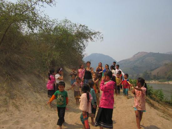 Als das Gebet vorbei war sah man die Erleichterung aller Falangs in den Augen. Nun nahmen alle Einheimischen diese Armbaenchen gingen zu den Falangs und schnuerten immer eines um das Handgelenk. Dabei sagten sie was auf laotisch. Sie wuenschten immer Glueck, Gesundheit in der Familie, Geld und das uebliche was man sich sonst wuenscht. Dies sagte zumindest Loon, was sie genau sagten warden wir nie erfahren. Diese Armbaendchen darf man nicht selbst abziehen. Sie muessen von alleine abfallen, sonst wuede es kein Glueck bringen. Danach wurde das Buffet eroeffnet. Niami! Es gab Huehnchen, Sticky rice, Suppen, Gemuese, Fleisch und vieles anderes. Diese Grosszuegigkeit war unglaublich! Natuerlich gab es Bialao dazu. Komischerweise gingen die anderen Falangs recht frueh. Wir erfuhren danach, dass das eine Geburtstagsfeier von einem sehr sympathischen Franzosen war der dort mit seinem Freund zwei Schulen und eine Bruecke gebaut hatte. Dieser fragte uns gleich, ob wir nicht lust haetten am naechsten Tag diese Schule mit ihnen zu besuchen. Die befand sich ca 4 Stunden mit dem Boot von Luang Prabang. Die Kinder wuerden sich sehr freuen mehr weisse Leute zu sehen. Wir ueberlegten nicht lange, denn so ein Angebot bekommt man nicht jeden Tag.