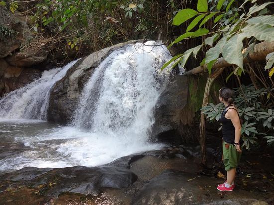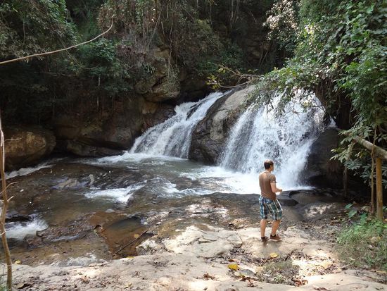 An diesem Tag mieteten wir uns 2 Scooter und machten uns auf den Weg auf die linke Strassenseite Chiang Mais. Alleine die Tatsache links zu fahren war speziell. Doch der Verkehr war noch eine Stufe spezieller. Nach wenigen minuten haten Teresa und Michi jedoch den kniff raus und flitzten wie die Thais durch die Srassen. Slalom um die Autos gehoerte zur norm =) Wir fuhren zu den Wasserfaellen. Dort angekommen, kamen wir aus dem Staunen nicht mehr heraus. Doch seht selbst.