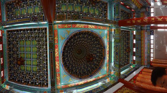 Am naechsten Tag goennten wir uns zum Morgenessen ein Buffet, dass Nicola den Tag zuvor entdeckt hatte. Es war echt komisch wieder mal Cornflakes mit normaler Milch zu essen. Voll und beftriedigt machten wir uns auf den Weg zum Chinesischen Tempel. Dies erweis sich als sehr schwierig, denn wir mussten wegen den riesiegen Strassen einen Umweg machen. Wir liefen und liefen und liefenn und waren fast am verzweifeln. Unterwegs kamen wir ab und zu an Maenner vorbei die hemmungslos von der Bruecke pinkelten. Einer schloss sogar seine Augen ganz fest in der Hoffnung, dass wir ihn so nicht sehen=) Irgendwann passte die Wegbeschreibung vom Reisefuehrer auch wieder und der Huegel auf dem der Tempel stand, hatten wir verschwitzt bestanden. Die Muehe hat sich gelohnt. Es war ein wunderschoener Tempel. Diese satten Farben und Verzierunengen waren faszinierend. Im Tempel selber waren die Decken wundervoll angepinselt.