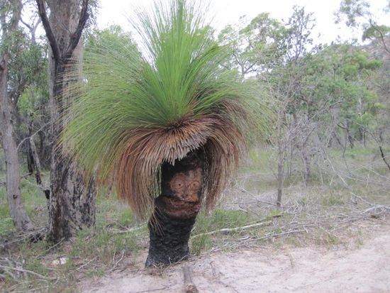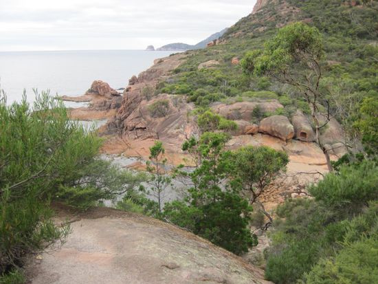 Zunächst geht es zur Wineglass Bay, vorher ist jedoch ein steiler Anstieg zu überwinden, an dessen Ende ein Aussichtspunkt lockt. Das Wetter ist durchwachsen, die Sicht nicht besonders gut. Von der Wineglass Bay geht es quer über die Halbinsel zum Hazards Beach, von dort aus über einen Klippenweg wieder zurück. Von den exotischen Gewächsen fällt ein "Grasbaum" mit Gesicht ins Auge.