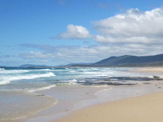 Auf dem weiteren Weg nach St. Helens geht es an vielen Stränden vorbei, die von der Straße aus allerdings nicht zu sehen sind. Schön ist der von Scamander, der Wellengang am Ozean war hier zu stark zum Baden, aber eine vom Fluß gespeiste Lagune war sehr gut zum Baden geeignet.