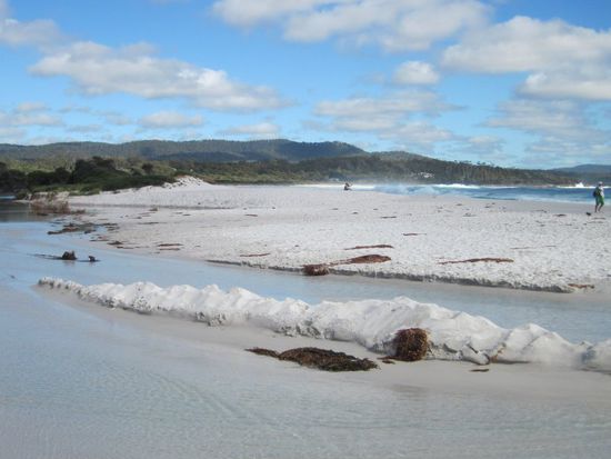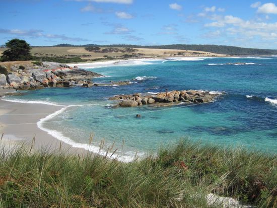 Eigentlich wollte ich in nördlicher Richtung an der Küste entlang wandern, der Weg führt allerdings weitgehend über größere Steine und bietet keinerlei Schatten, so kehre ich nach etwa einer halber Stunde wieder um und verbringe den Rest des Tages an der Binalong Bay. Hier hat man beim Baden die Wahl zwischen der ruhigen Lagune und dem heute recht stürmischen Meer.