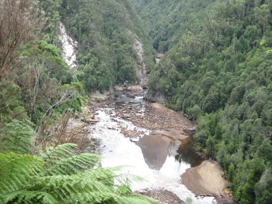 Die Bahn kommt etwas außerhalb von Strahan an, das Gleis bis ins Stadtzentrum gibt es nicht mehr. Das war aber eine schöne Gelegenheit, am Ufer zurück zu wandern. Am Wege liegt noch ein sehenswerter Park mit den Hogarth Falls.